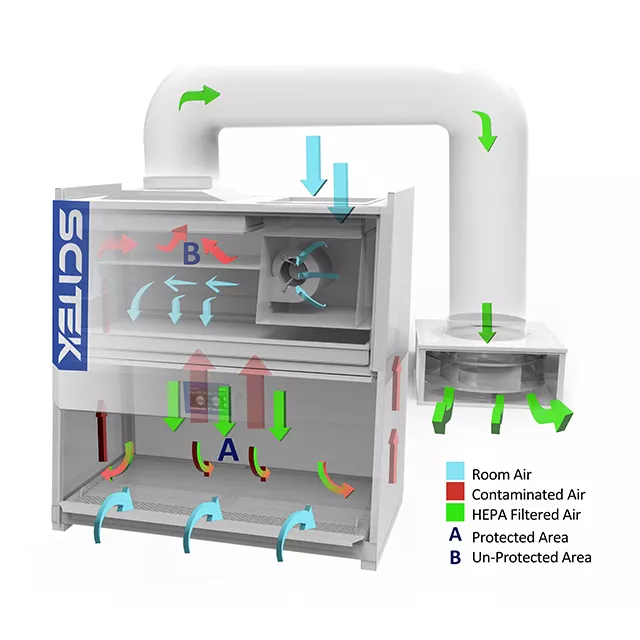 A Class II Type B2 biosafety cabinet utilizes a vertical laminar airflow pattern to provide maximum protection for personnel, products, and the environment. Air is drawn from the top of the cabinet, passed through HEPA filters, and circulated downward onto the work surface. The downward airflow prevents airborne contaminants from escaping into the laboratory, while the HEPA filters remove particles to maintain a clean and sterile work area. Excess air is exhausted through a dedicated duct system to the outside environment.